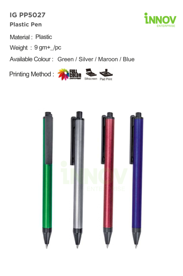 The IG PP5027 Plastic Pen is a sleek and professional writing instrument designed for businesses seeking Custom Personalized Pens that balance style, practicality, and branding impact. Featuring a slim cylindrical barrel, retractable click mechanism, and black clip, this pen offers a clean, modern profile suitable for both corporate and promotional use.