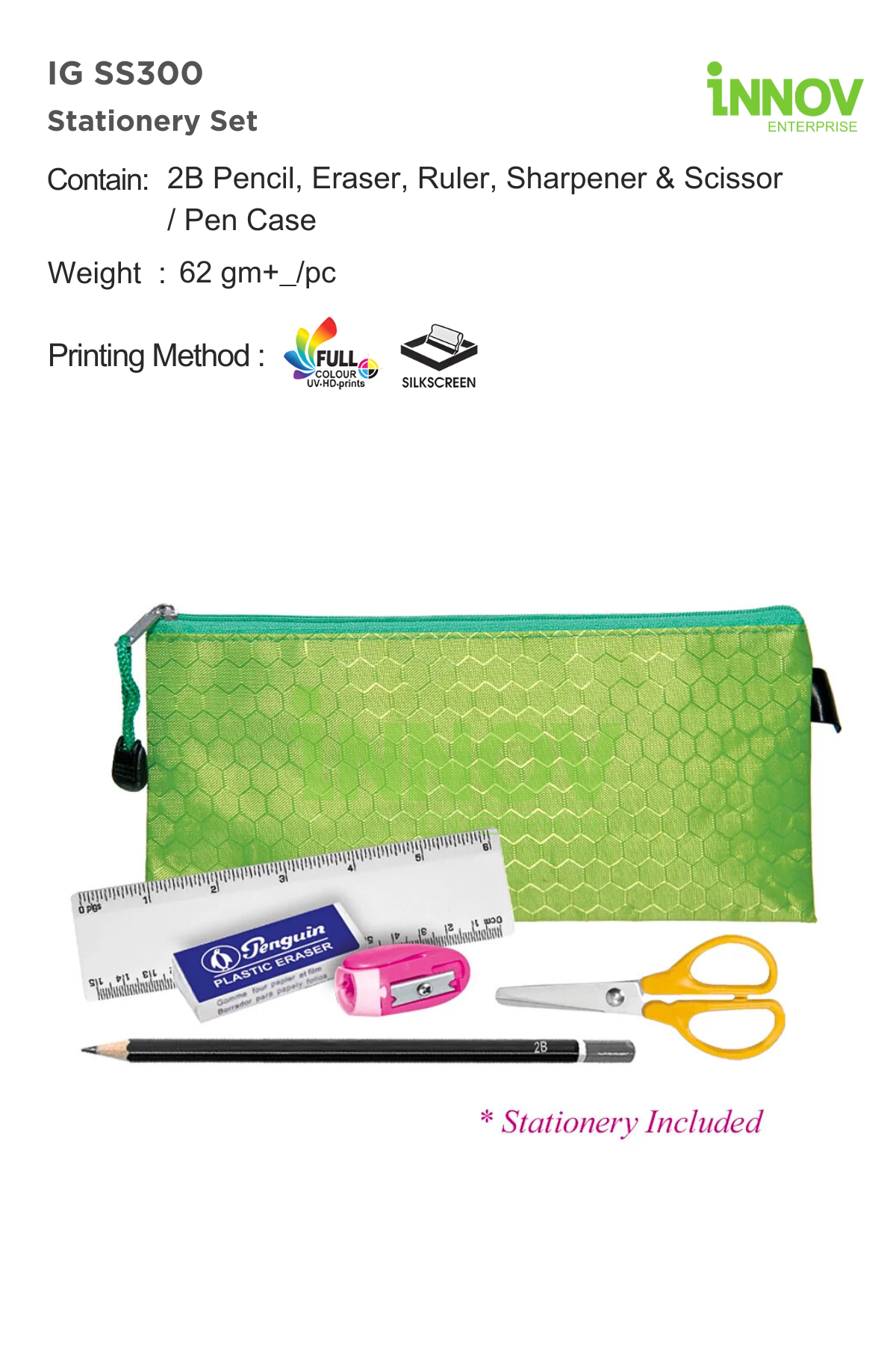 The IG SS300 Stationery Set is a practical Customised Stationery Gift Set ideal for everyday office use, personal needs, and corporate giveaways. Packed in a zip-up pen case, it includes a 2B pencil, eraser, ruler, sharpener, scissors, and pen case, providing a complete and convenient stationery solution in one compact set.