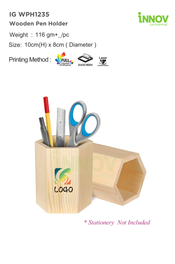 The IG WPH1235 Wooden Pen Holder is a compact and stylish Custom Wooden Pen Holder designed to keep desks organised while adding a natural, professional touch. Crafted from solid wood with a visible grain finish, its hexagonal shape offers enhanced stability and a distinctive look compared to standard round or plastic holders.