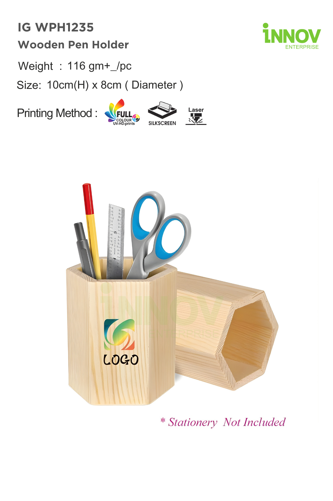Weighing approximately 116g and sized at 10cm (H) × 8cm (Diameter), this wooden pen holder fits neatly on any desk without taking up excess space. It comfortably stores pens, pencils, rulers, and small stationery items, making it ideal for daily office use, meetings, and work-from-home setups. Innov Enterprise offers professional customisation options to transform the IG WPH1235 into a refined branded desk accessory that supports long-term brand visibility.