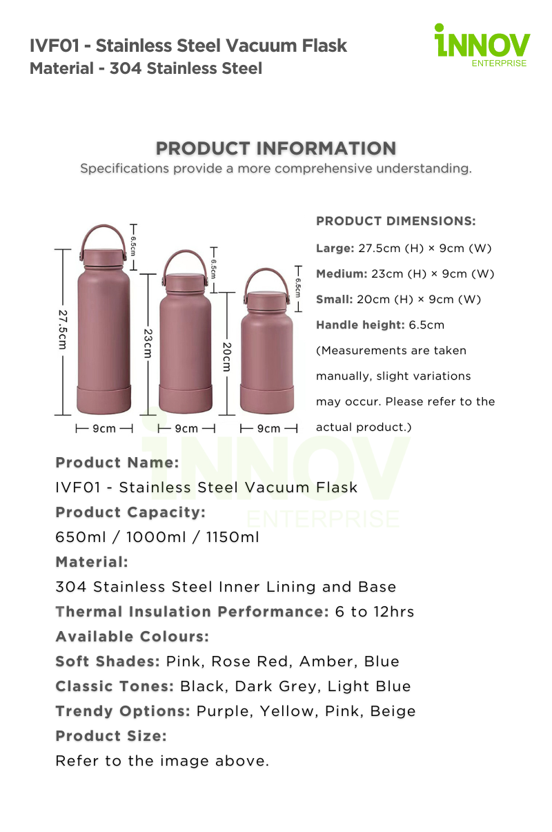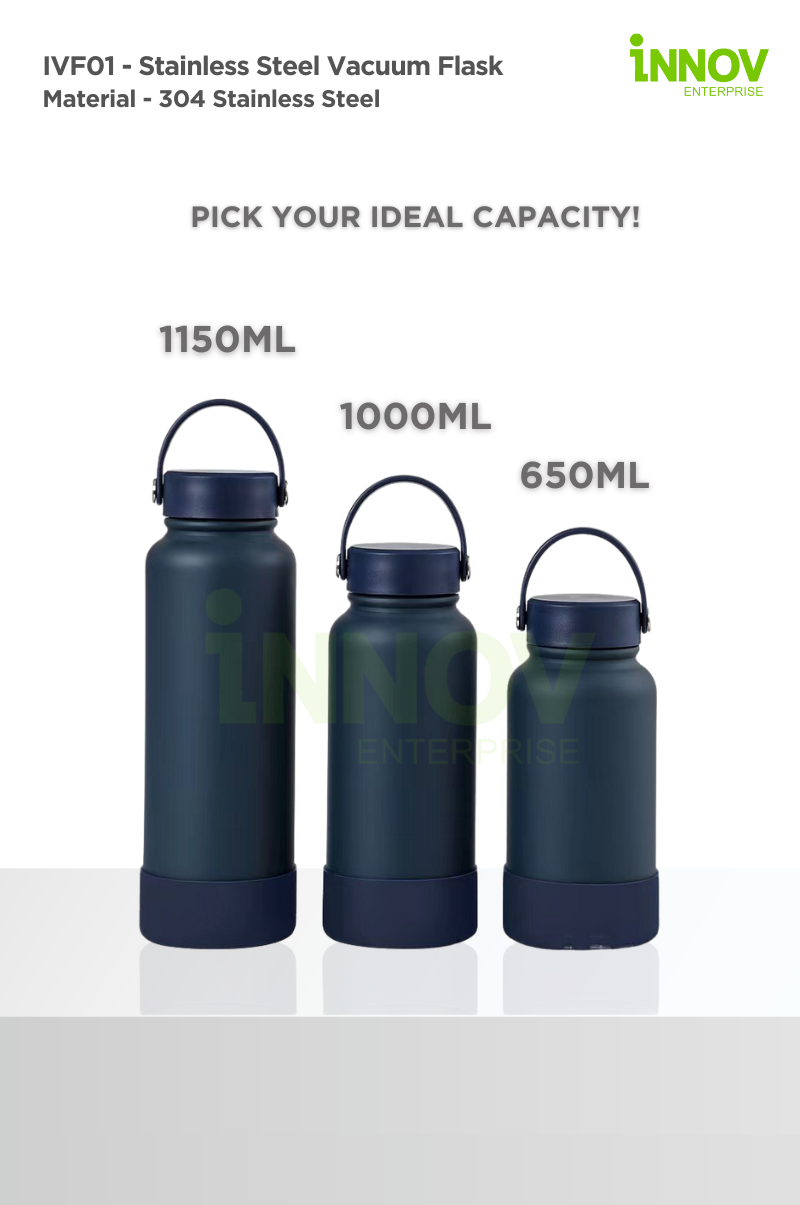 The IVF01 – Stainless Steel Vacuum Flask combines style, durability, and insulation, ensuring beverages stay hot or cold for up to 12 hours. Made from premium 304 stainless steel, this double-wall insulated thermos tumbler offers rust resistance, food-grade safety, and long-lasting performance, making it ideal for daily use, travel, office, and outdoor activities. Available in three sizes—Large (1150ml), Medium (1000ml), and Small (650ml)—it is designed for convenience and portability, featuring a handheld cup lid, anti-slip silicone base, and a smooth rounded mouth for a comfortable drinking experience.