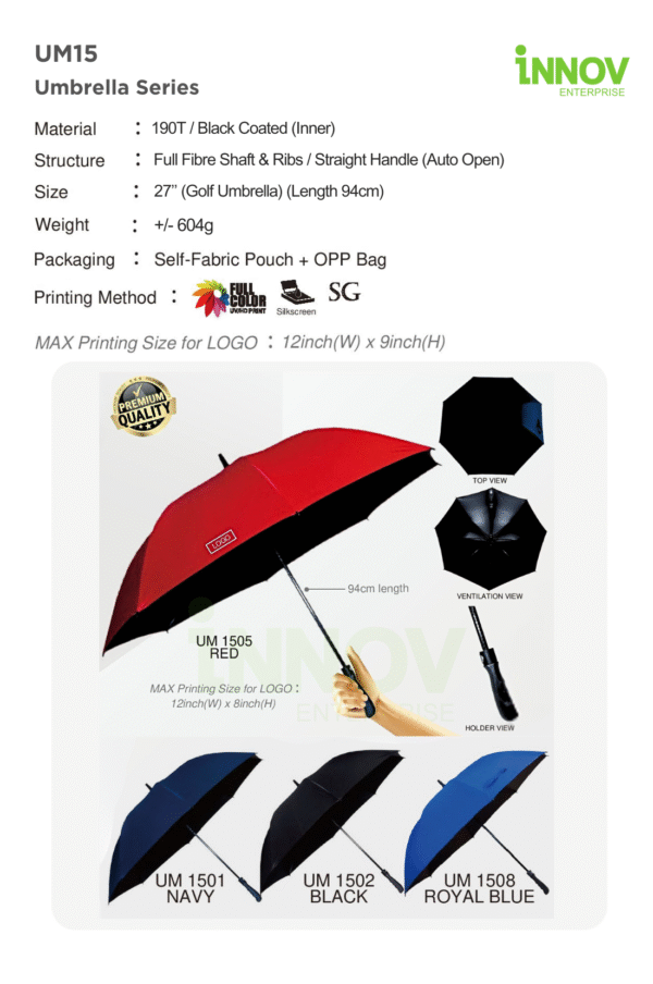 The auto-open straight handle allows quick one-press operation, and the 27″ canopy delivers wide coverage without feeling too heavy at ±604g. Packed in a self-fabric pouch and OPP bag, the UM15 comes in 4 Available Colours, with a large 12″ × 9″ print area for bold, visible branding.