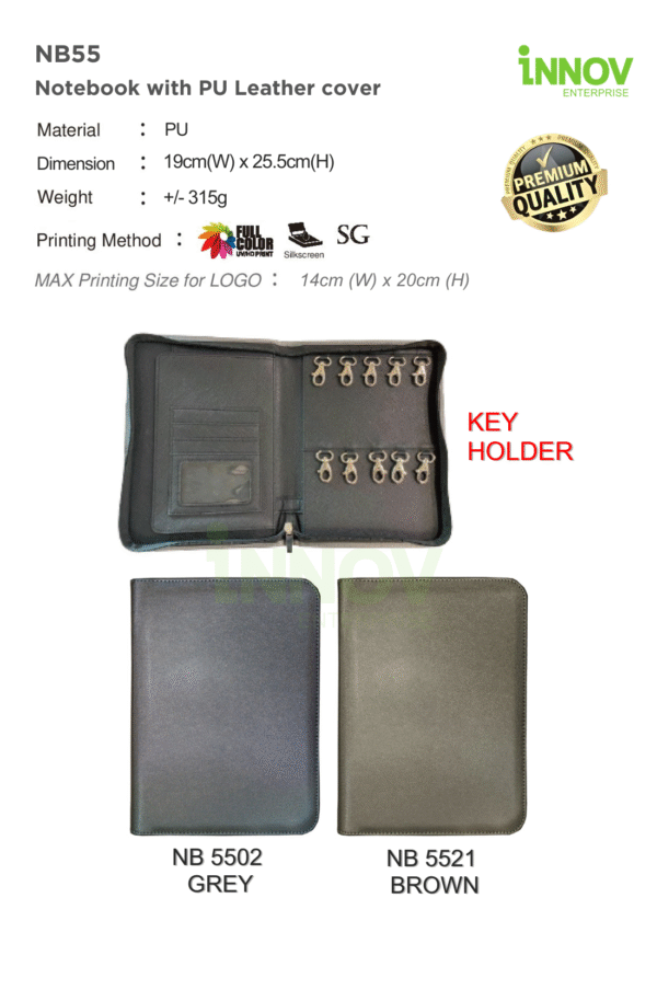The NB55 Notebook with PU Leather Cover is a multifunctional organiser created for professionals who need a sleek and practical Custom Key Holder Zip solution. Designed with a refined PU leather finish, it combines a full writing notebook with an integrated zip key holder—making it ideal for corporate teams, real estate groups, facility managers, security staff and premium gifting. Innov Enterprise offers full customisation, ensuring your logo stands out clearly on every unit.