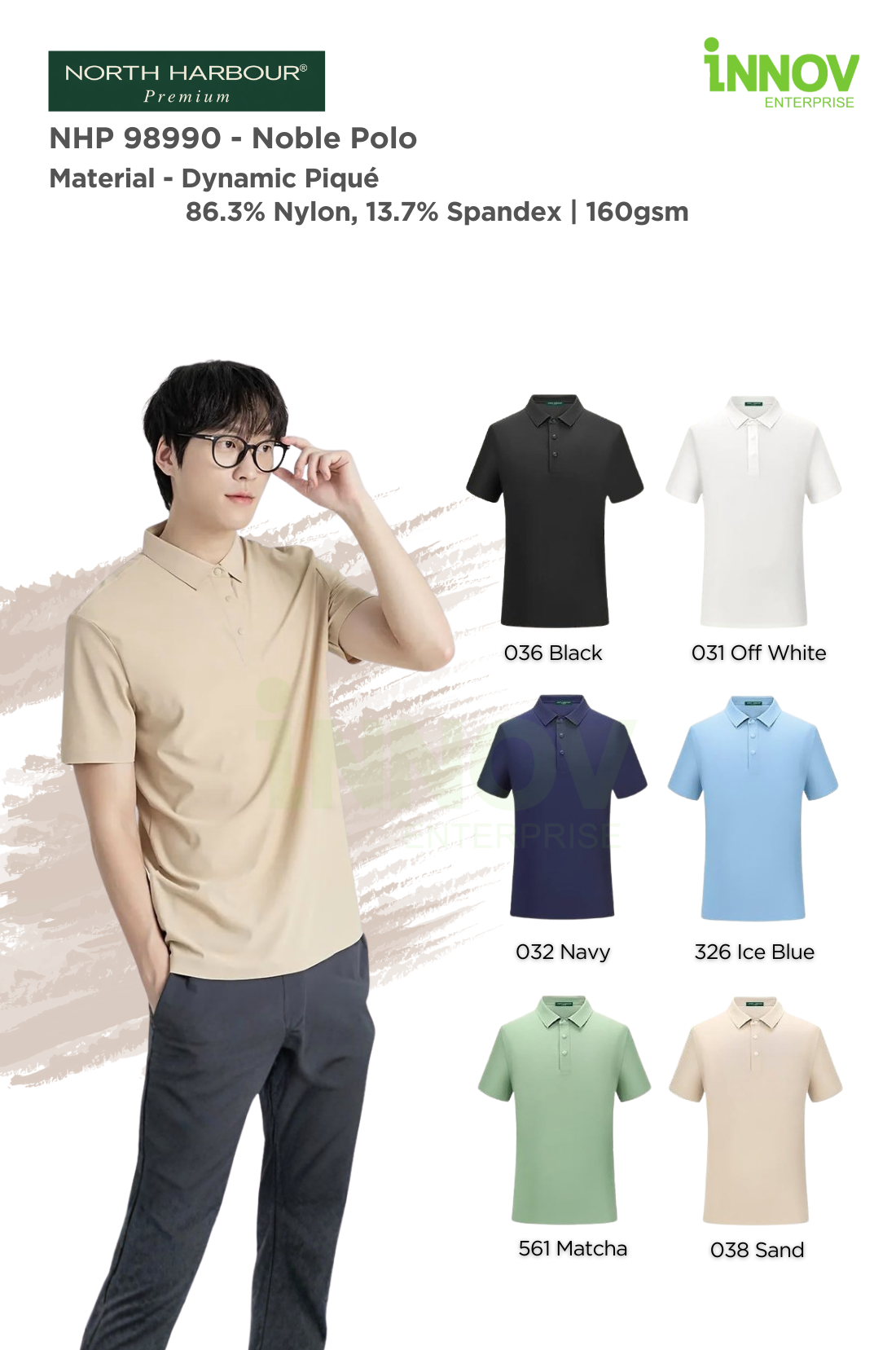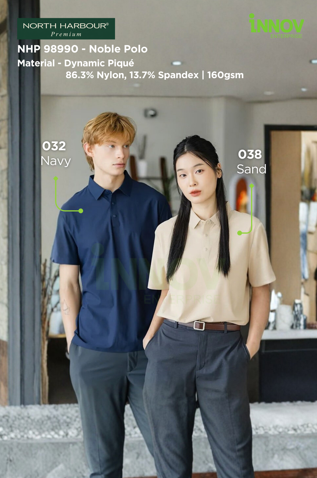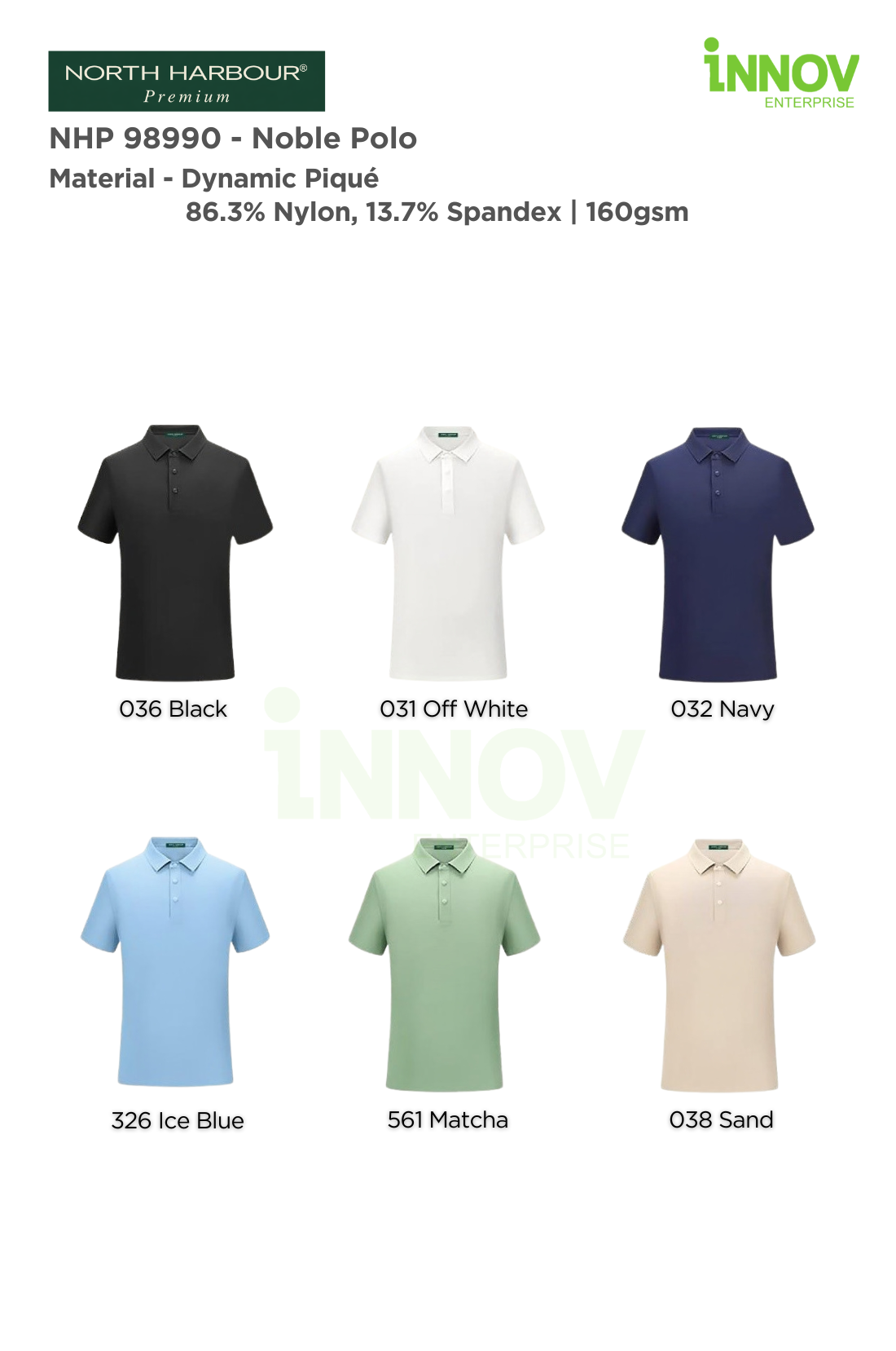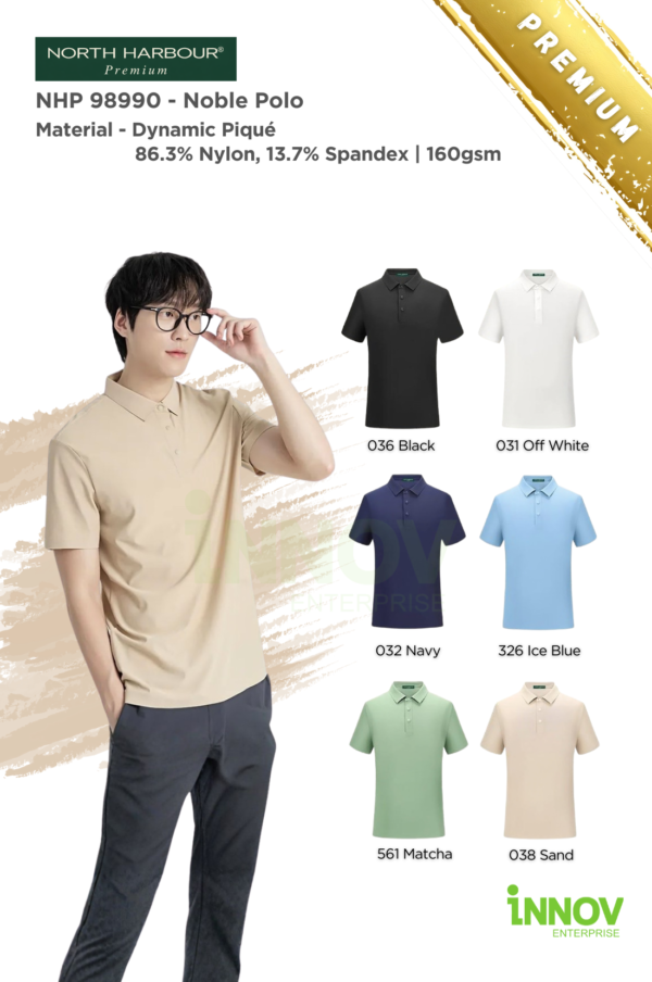 The NHP 98990 – Noble Polo is a premium wrinkle-resistant unisex polo designed for offices, workwear and promotional use where a clean, professional appearance matters. Made from Dynamic Piqué fabric (86.3% Nylon, 13.7% Spandex, ~160–165gsm), this polo offers a smooth, refined surface that holds its shape well—making it ideal for Polo Shirt Logo Printing with long-lasting results. Available in 6 colours, it provides versatile colour options suitable for both corporate branding and everyday wear.