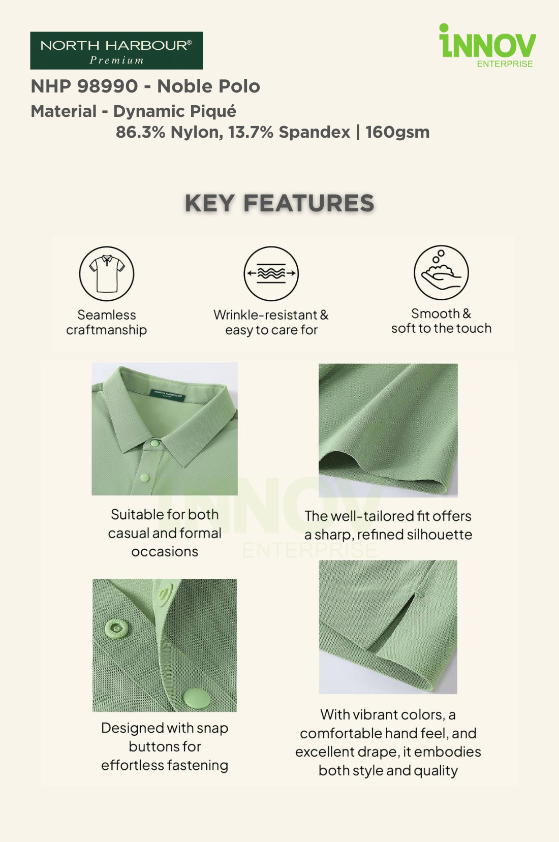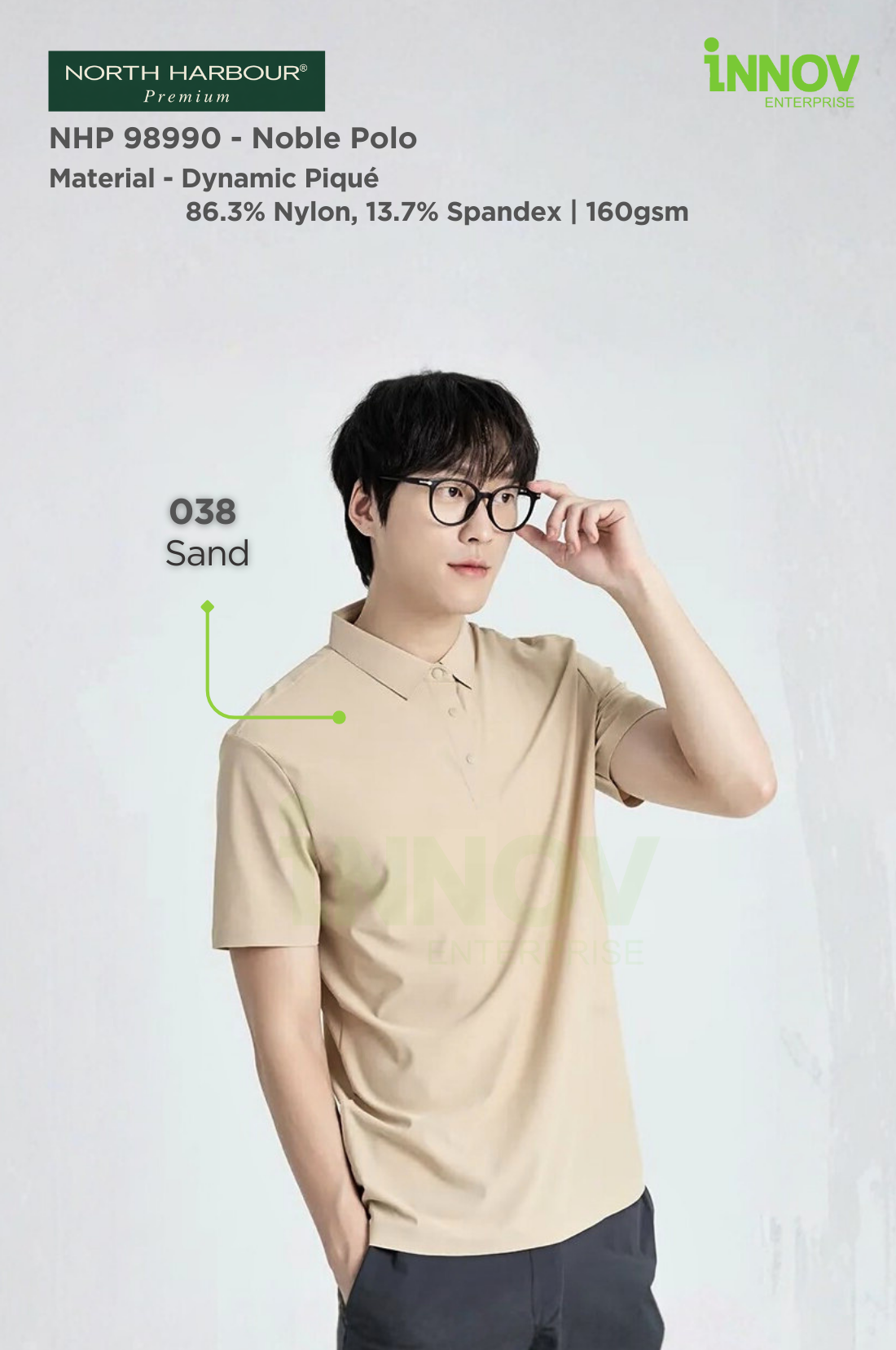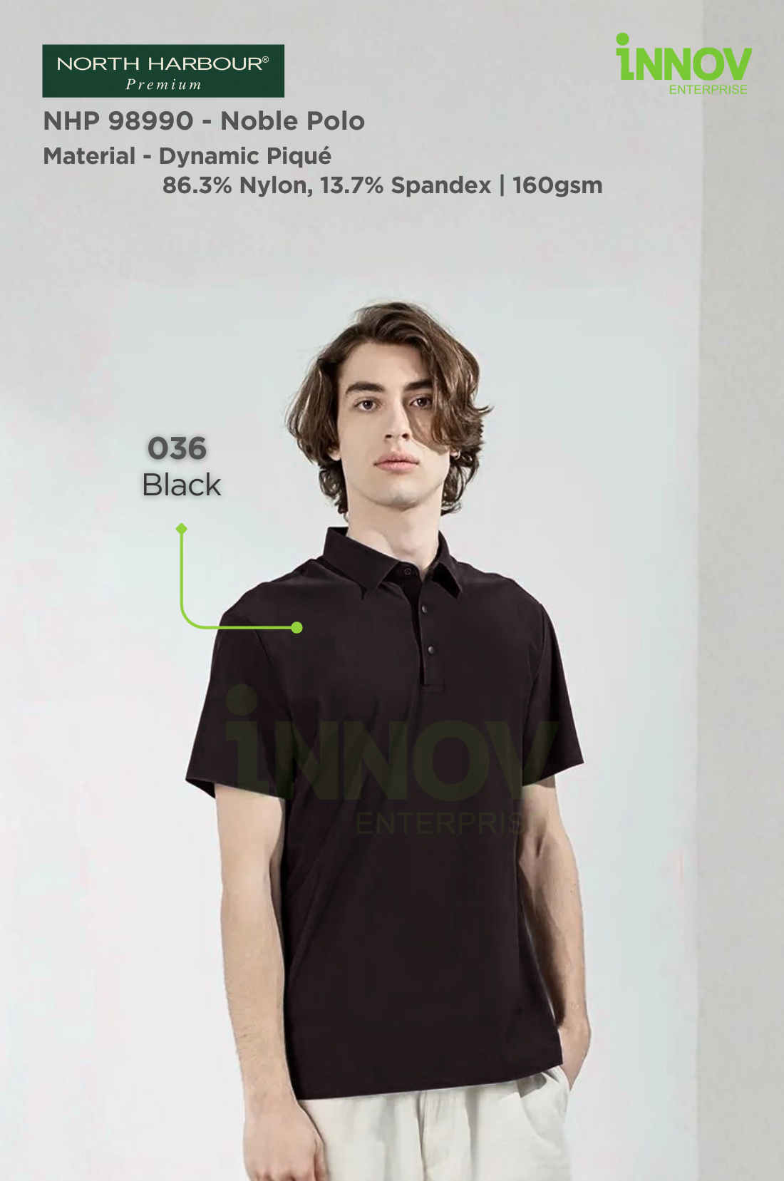 The NHP 98990 – Noble Polo is a premium wrinkle-resistant unisex polo designed for offices, workwear and promotional use where a clean, professional appearance matters. Made from Dynamic Piqué fabric (86.3% Nylon, 13.7% Spandex, ~160–165gsm), this polo offers a smooth, refined surface that holds its shape well—making it ideal for Polo Shirt Logo Printing with long-lasting results. Available in 6 colours, it provides versatile colour options suitable for both corporate branding and everyday wear.