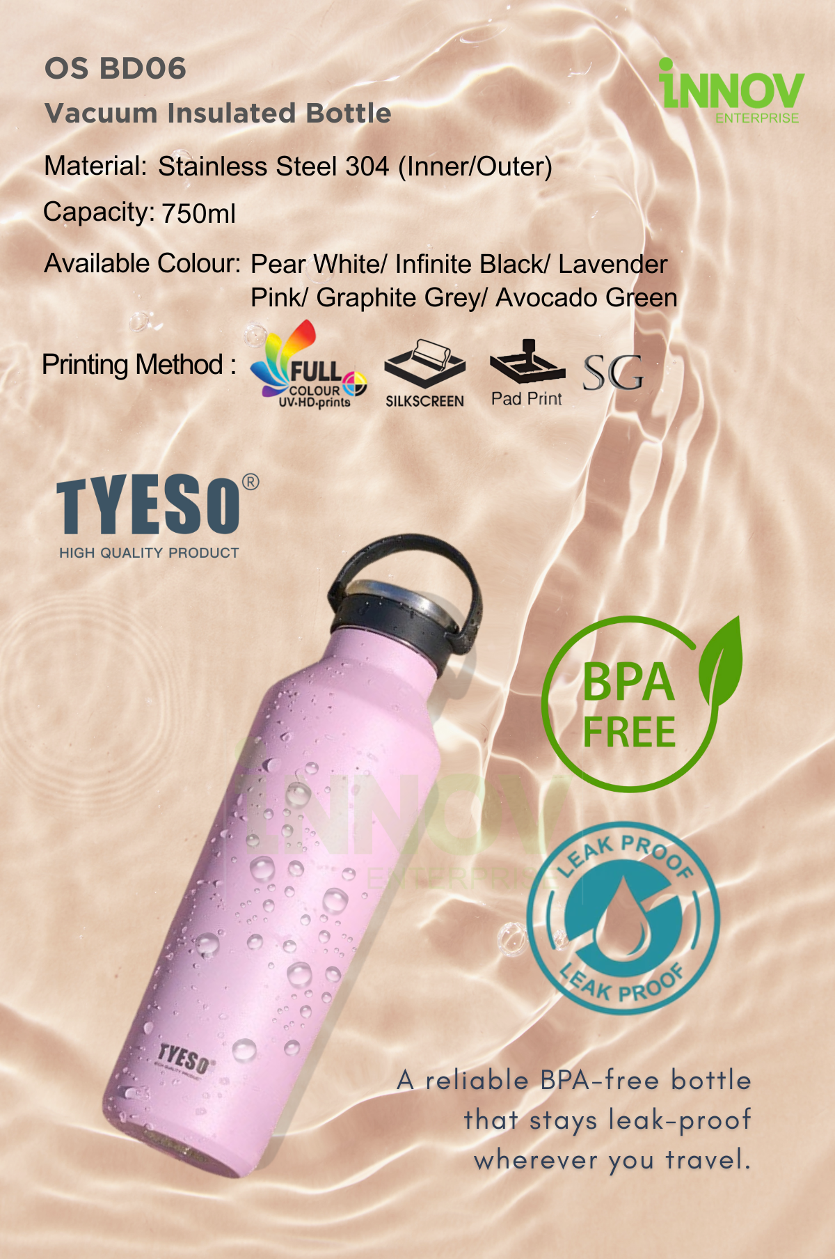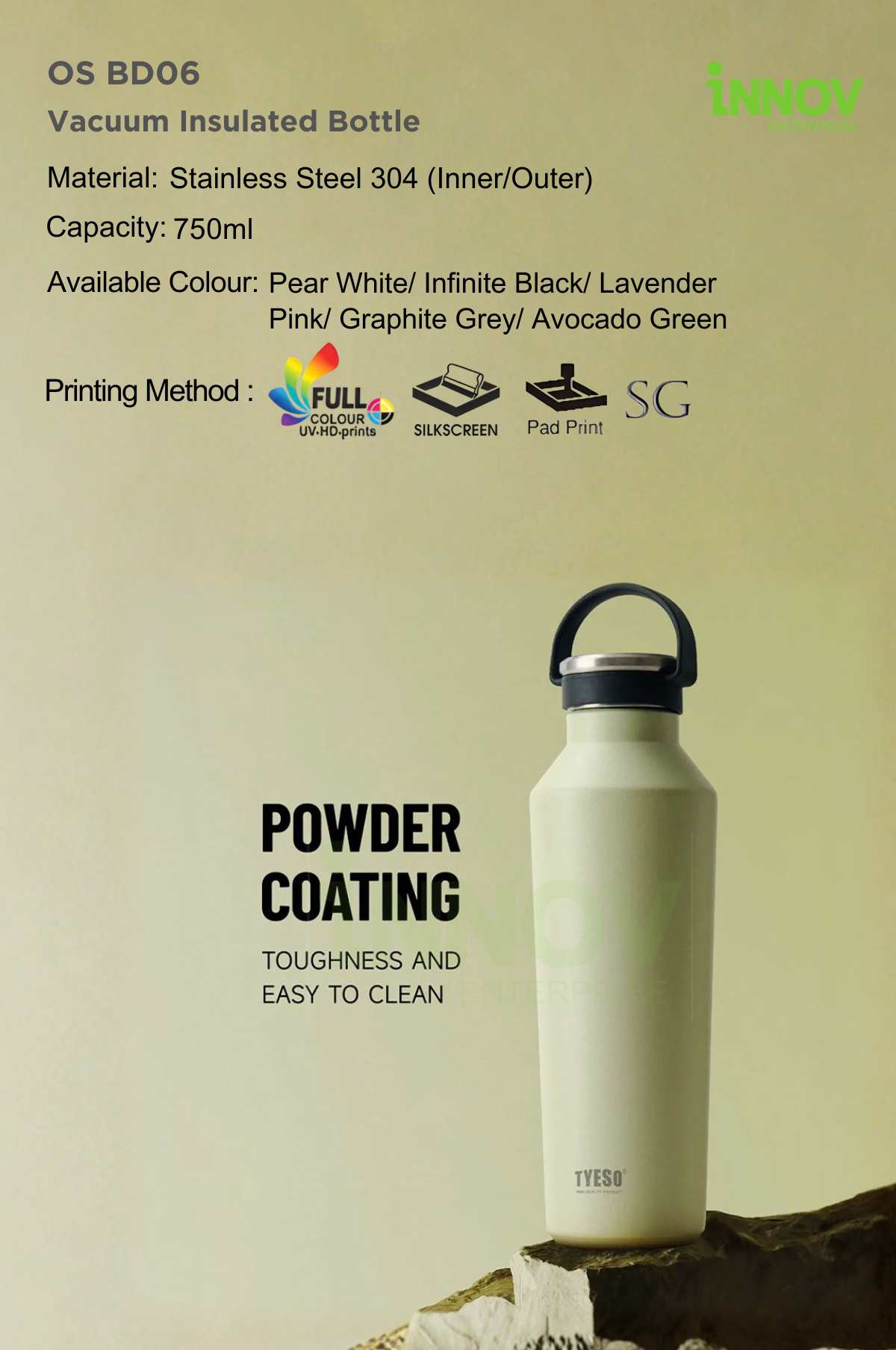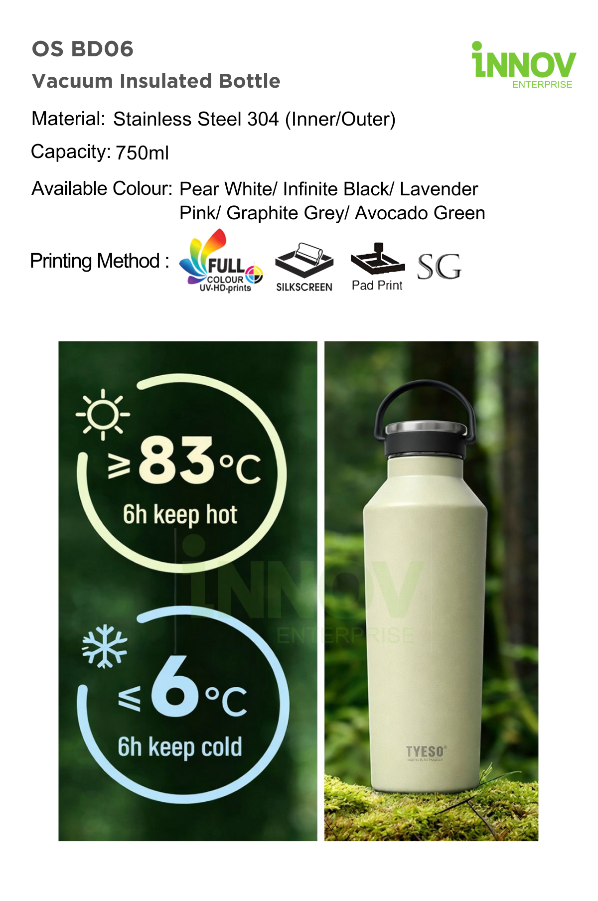The OS BD06 Vacuum Insulated Bottle is a durable and versatile Custom Vacuum Insulated Bottle developed by Innov Enterprise for daily use, corporate gifting, and promotional campaigns. Under the trusted TYESO brand,  this bottle is crafted with double-wall Stainless Steel 304 (inner and outer), it provides dependable insulation to keep beverages hot or cold for extended hours, making it well suited for offices, outdoor activities, commuting, and travel.