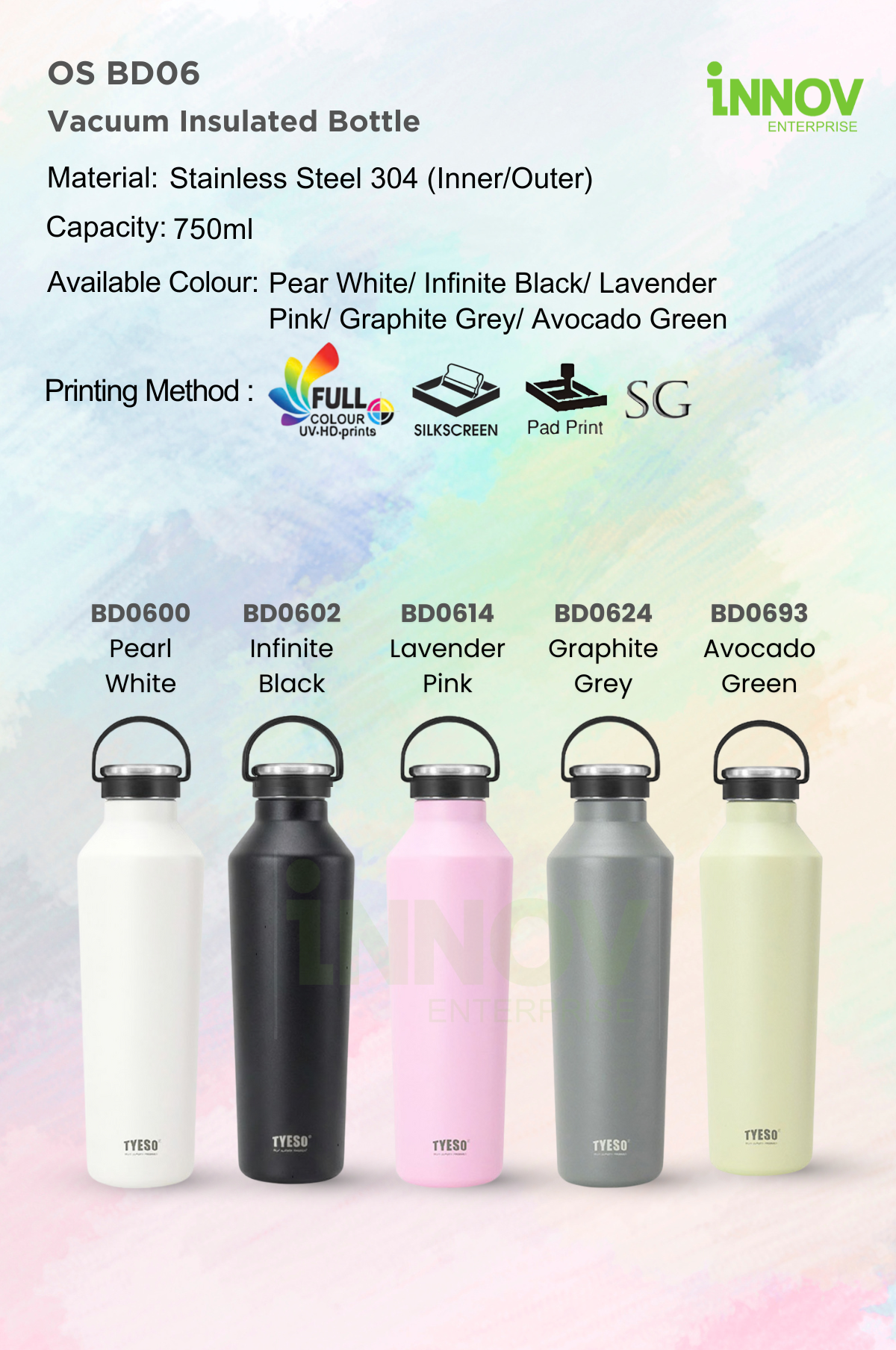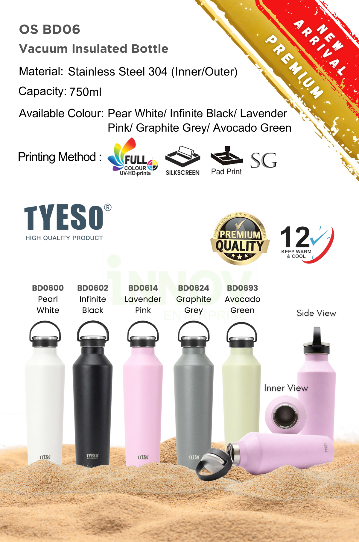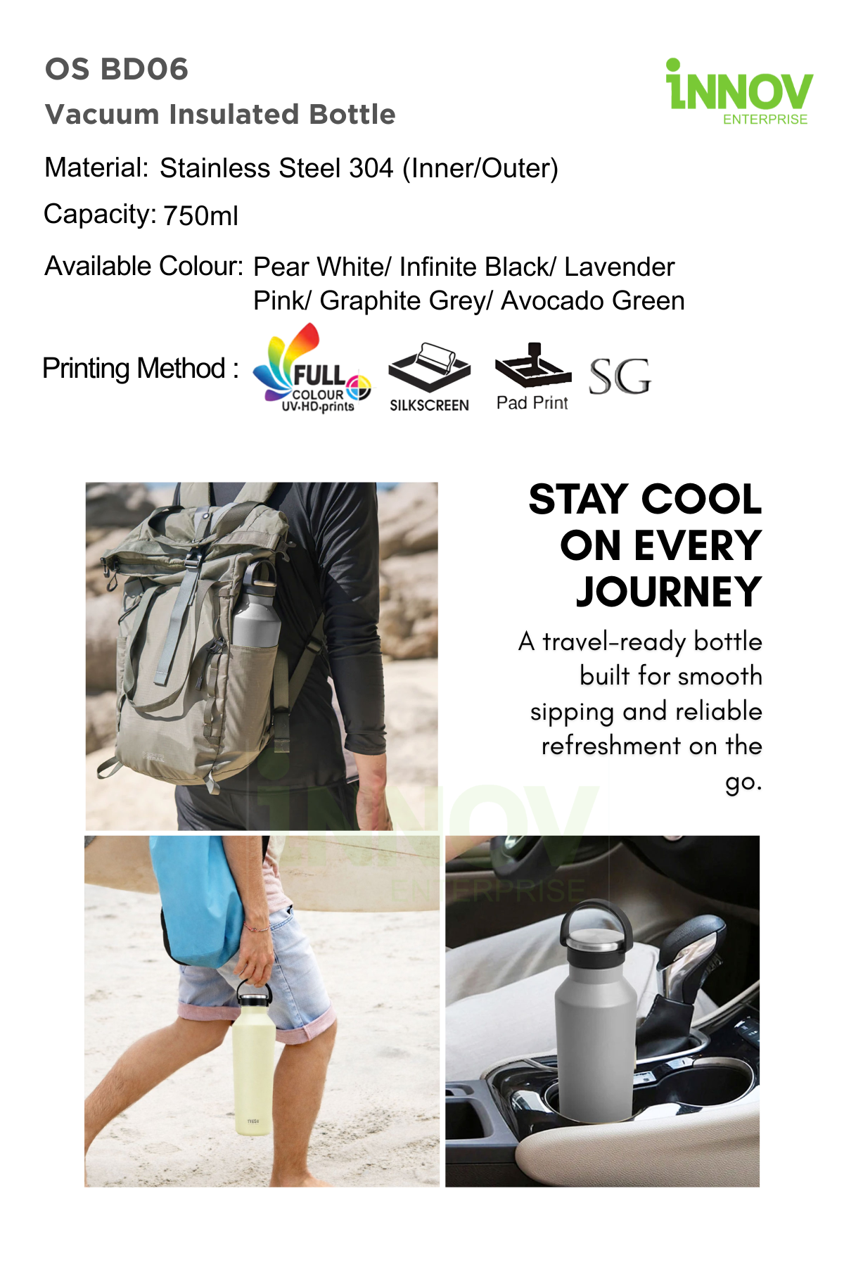 The OS BD06 Vacuum Insulated Bottle is a durable and versatile Custom Vacuum Insulated Bottle developed by Innov Enterprise for daily use, corporate gifting, and promotional campaigns. Under the trusted TYESO brand,  this bottle is crafted with double-wall Stainless Steel 304 (inner and outer), it provides dependable insulation to keep beverages hot or cold for extended hours, making it well suited for offices, outdoor activities, commuting, and travel.