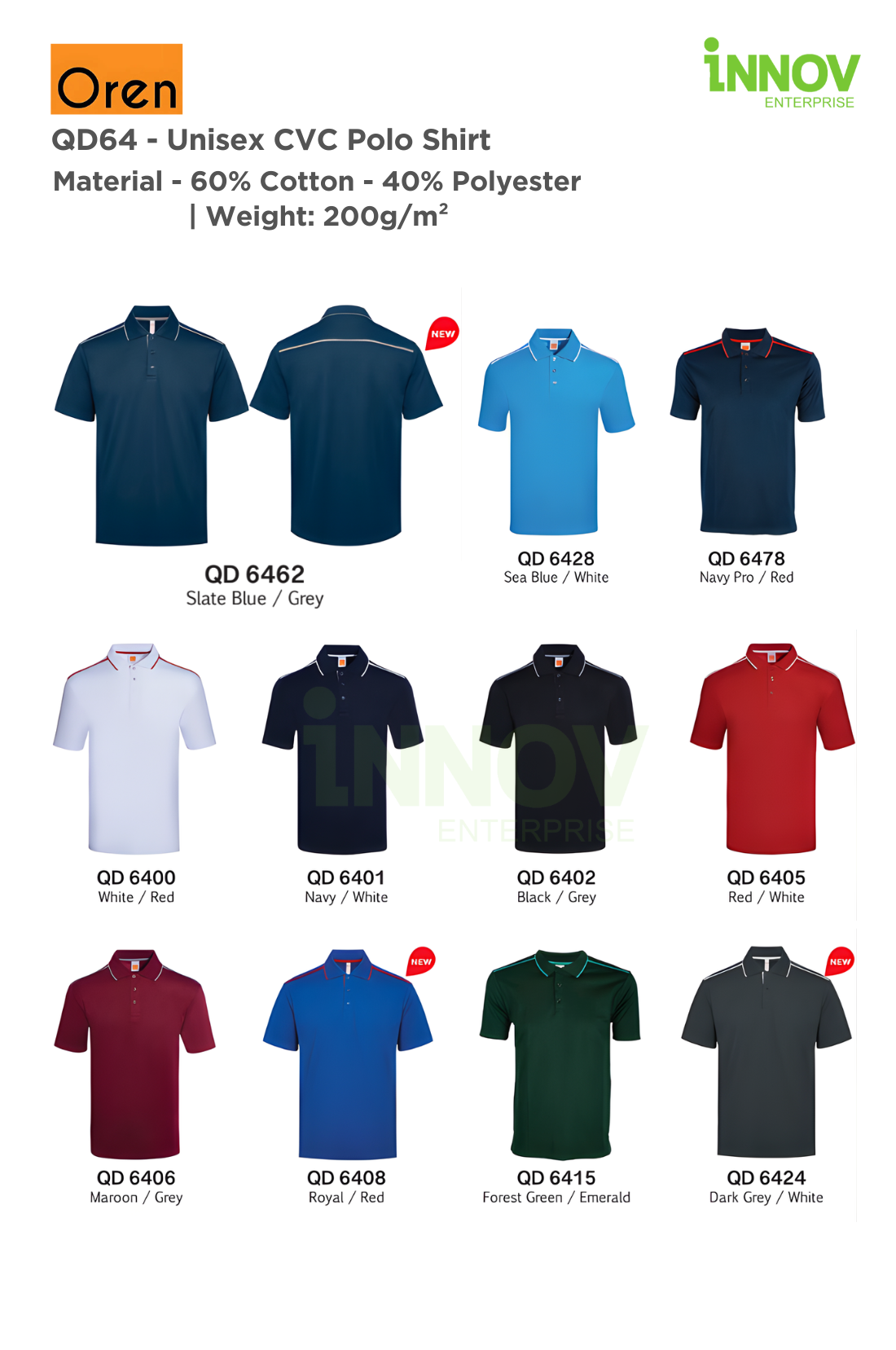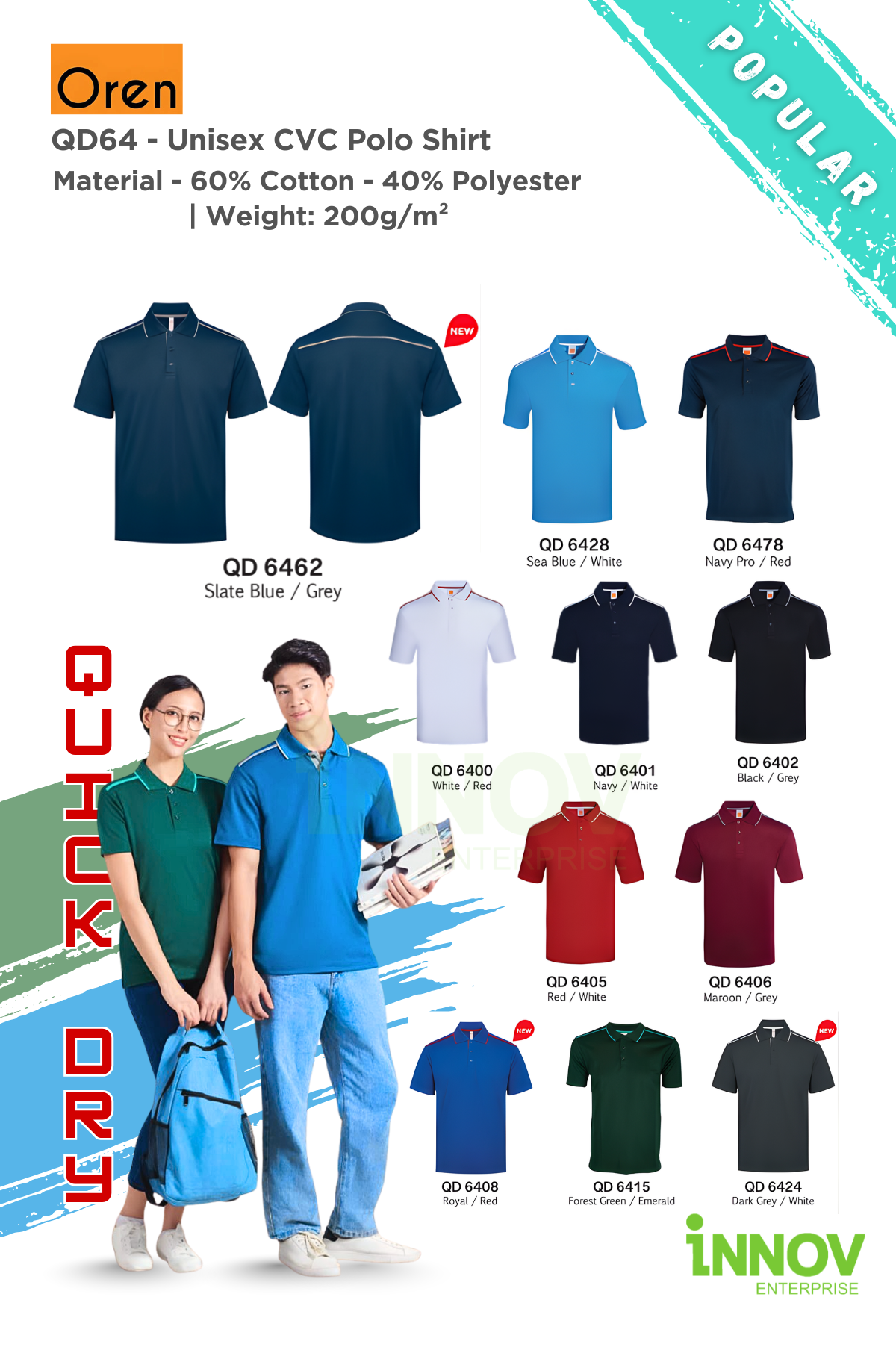 The QD64 Unisex CVC Polo Shirt delivers the perfect balance of style, comfort, and durability—making it an ideal Unisex CVC Polo Shirt for corporate uniforms, team apparel, and promotional wear. Crafted from a premium 60% Cotton and 40% Polyester blend with a 200g/m² fabric weight, it combines the soft comfort of cotton with the quick-dry performance and easy-care benefits of polyester.