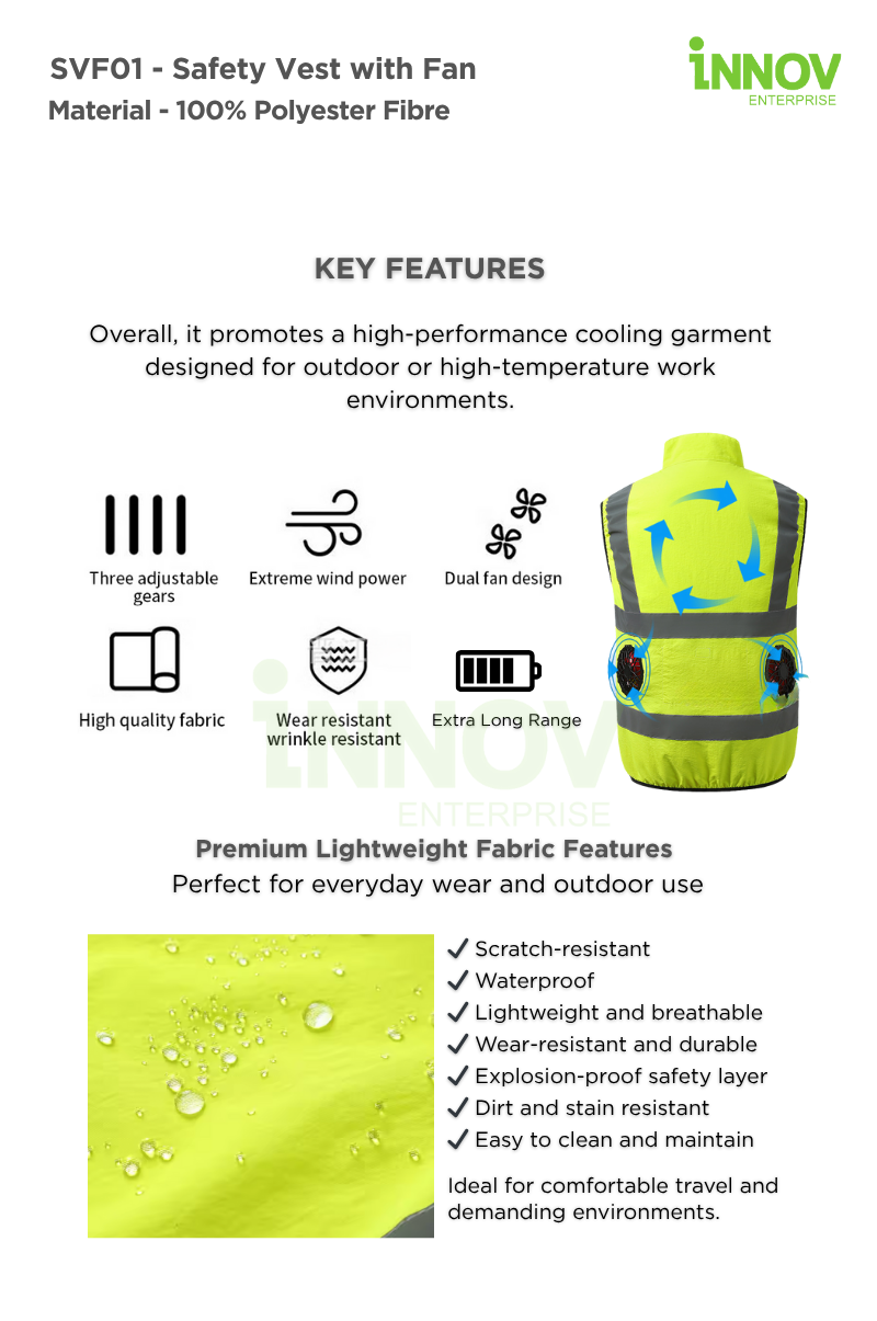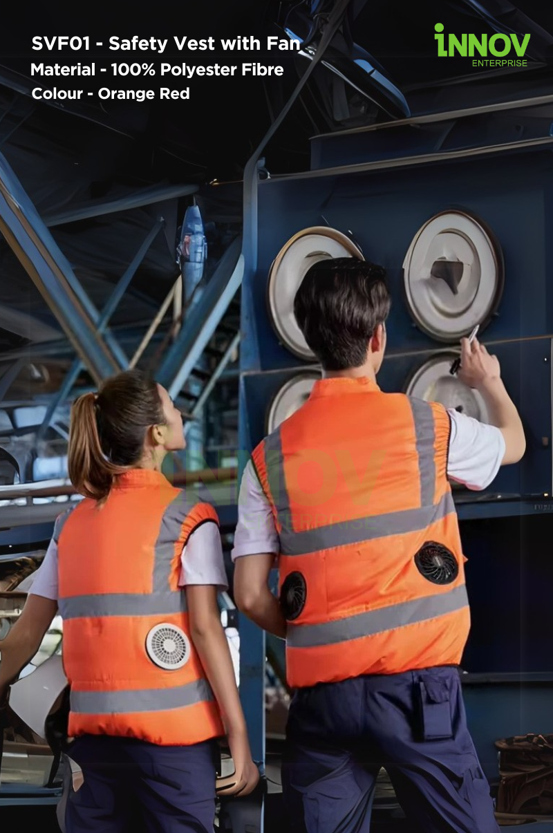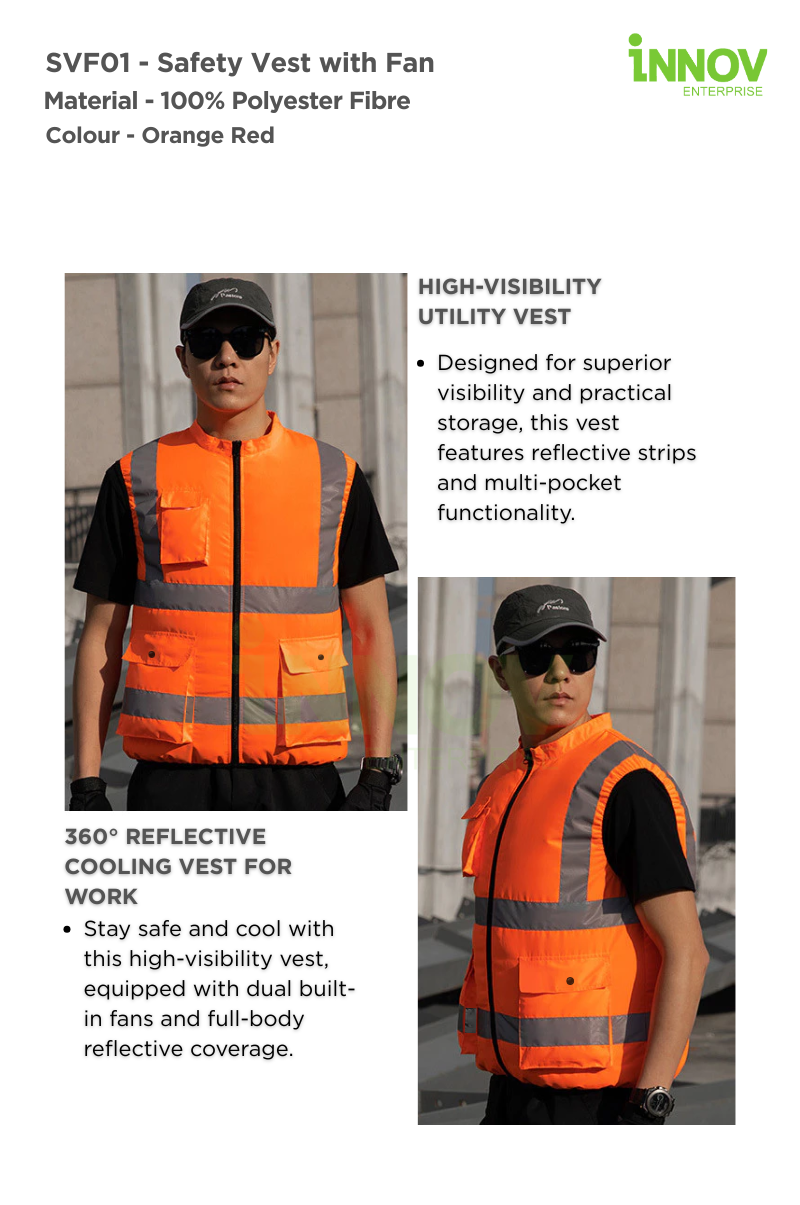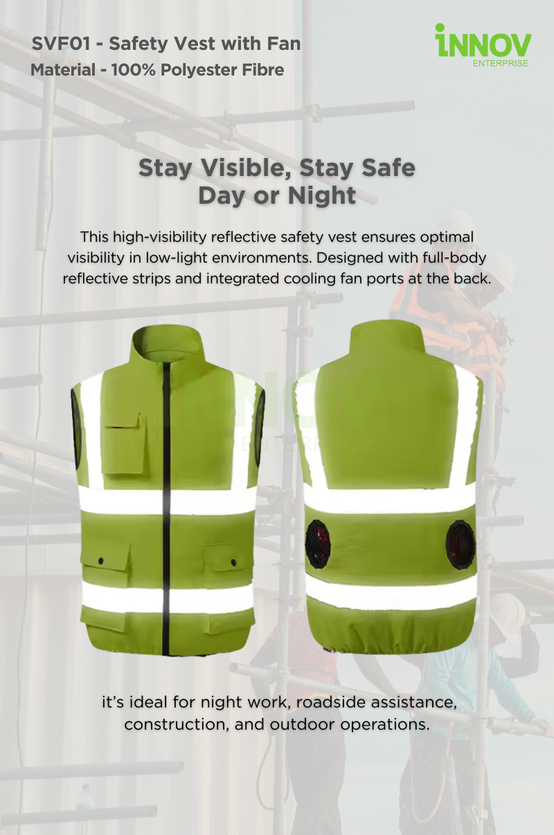 Stay visible and ventilated in high-temperature environments with the SVF01 – Safety Vest with Fan—a high-performance, dual-purpose garment designed to improve safety and comfort in demanding work conditions. Engineered with dual USB-powered fans, this vest offers consistent airflow to reduce heat stress while maintaining full-body visibility through its 360° reflective design.