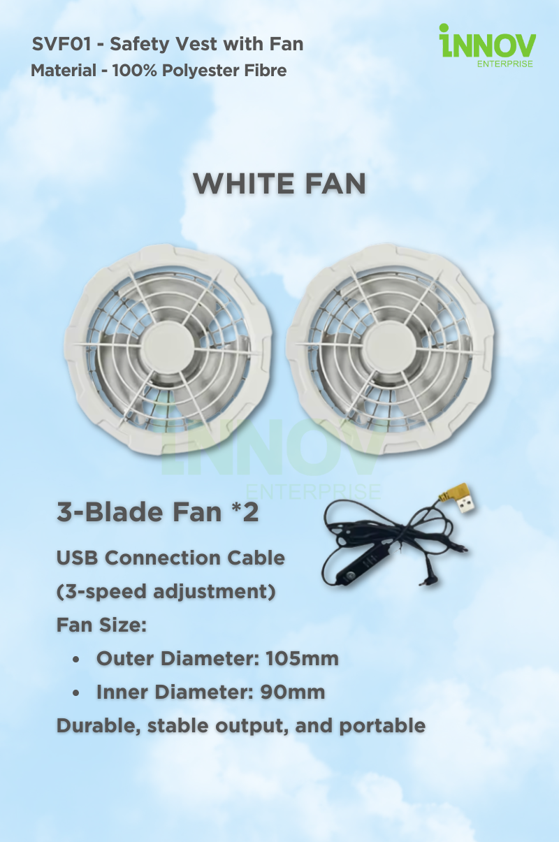 Crafted from 100% polyester fibre, the SVF01 is lightweight, waterproof, breathable, and wear-resistant—ideal for extended use in outdoor or industrial settings. The integrated left and right side fans are compact yet powerful, offering three adjustable speed settings and removable for easy maintenance.