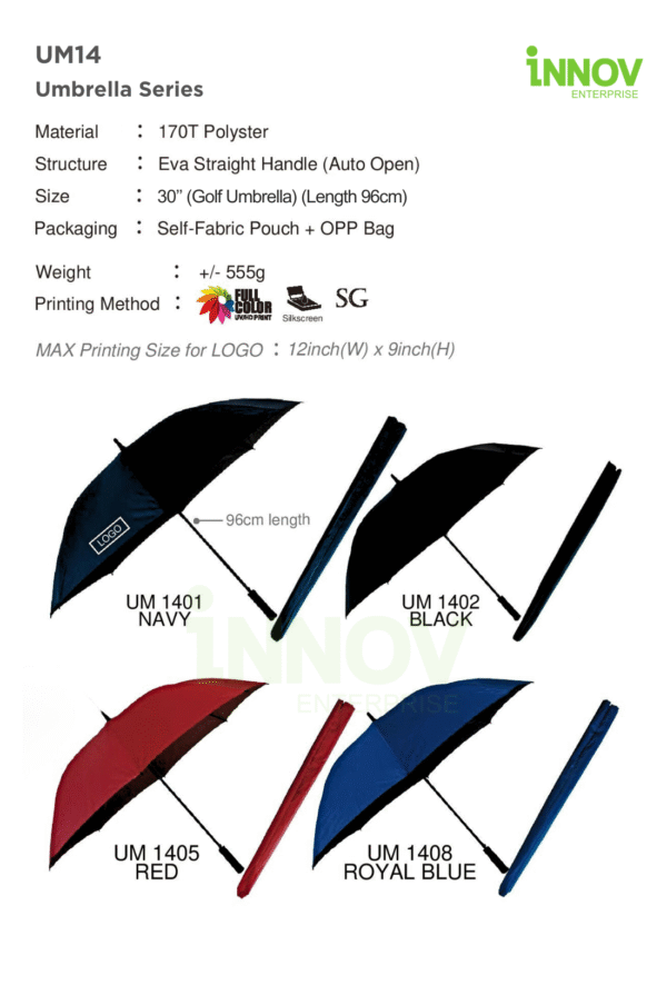 The UM14 Umbrella Series is a sturdy and professional Automatic Golf Umbrella made for outdoor events, corporate gifting, and everyday use. Its wide 30″ canopy provides strong protection from sun and rain, while the 170T polyester fabric offers durability and quick-dry performance. The auto-open function ensures instant coverage with one press, and the EVA straight handle provides a comfortable, secure grip.