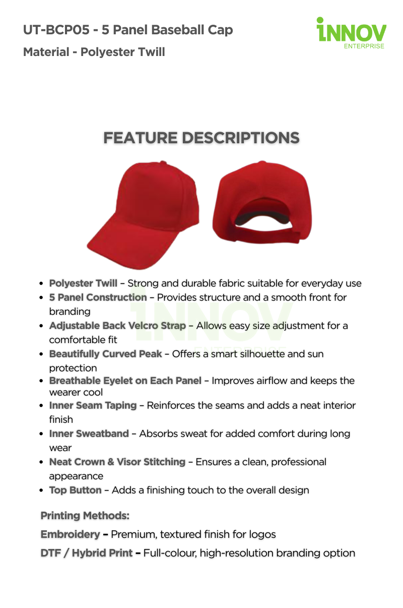Available in 5 versatile colour options, the UT-BCP05 – 5 Panel Baseball Cap lends itself to a wide range of applications—from corporate uniforms and retail merchandise to team outfits and event giveaways. Once customised with embroidery or DTF/hybrid printed logos, this cap becomes a high-impact promotional accessory that reinforces your brand wherever it’s worn.