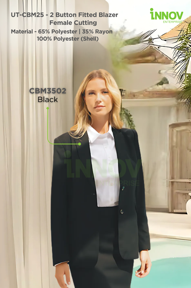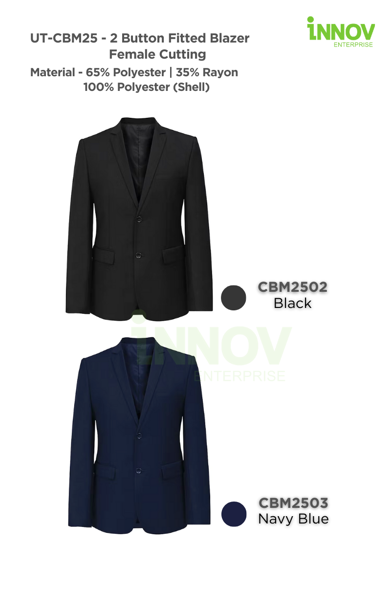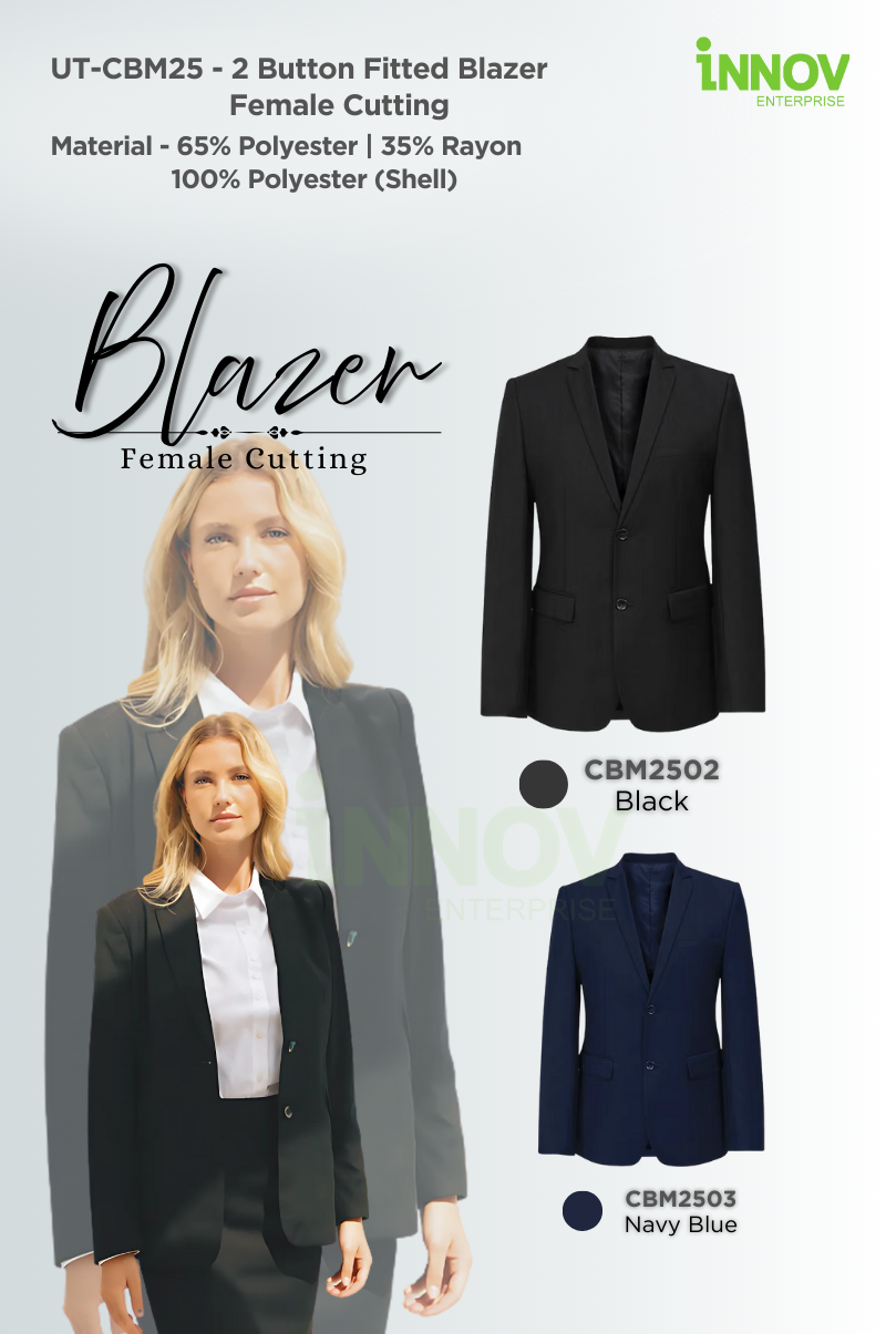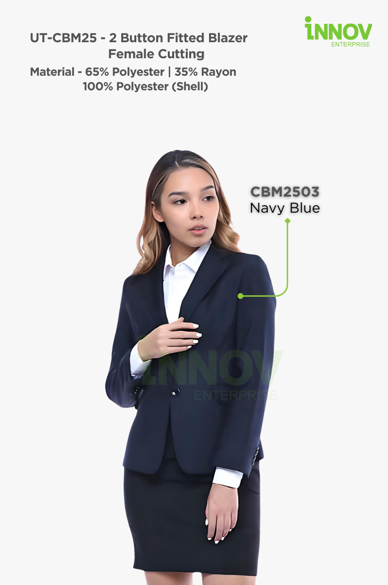 The UT-CBM25 2 Button Fitted Blazer – Female Cutting is a refined corporate essential designed to balance style, comfort, and practicality. This Women Slim Fit Blazer is tailored with a female-specific cut, creating a flattering, professional silhouette that enhances confidence in any formal or workplace setting. Crafted from a 65% polyester and 35% rayon blend with a 100% polyester shell lining, this blazer is both durable and breathable, ensuring all-day wearability. The flat collar and two-button closure deliver a timeless look, while two external pockets add convenience without compromising style. Whether worn as part of a full suit set or styled individually with shirts, blouses, skirts, or trousers, the UT-CBM25 offers versatile pairing options that suit corporate uniforms, events, and professional presentations.