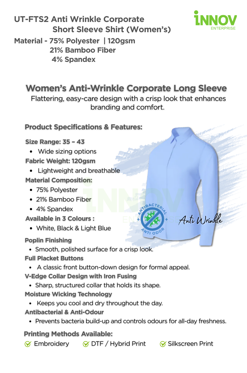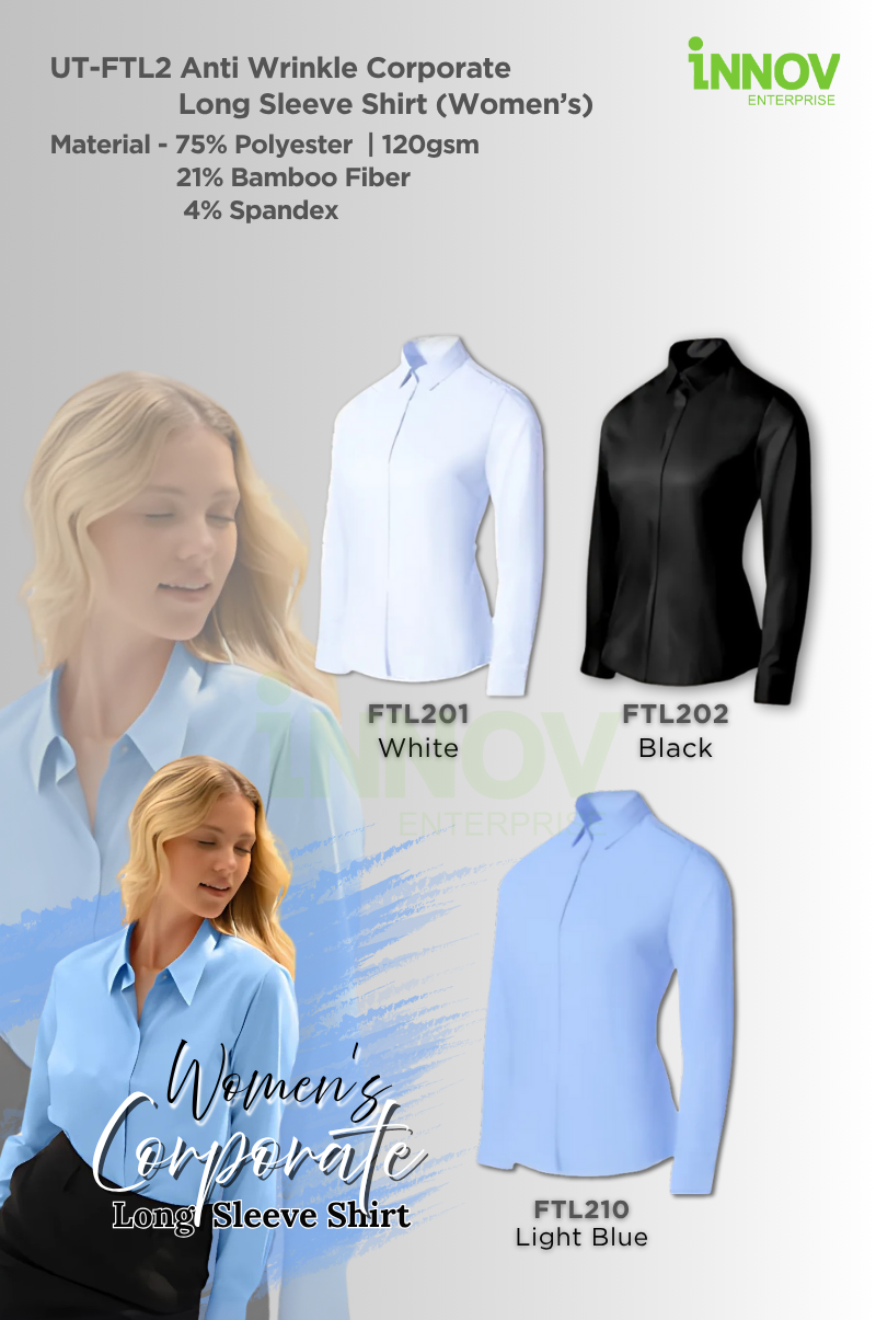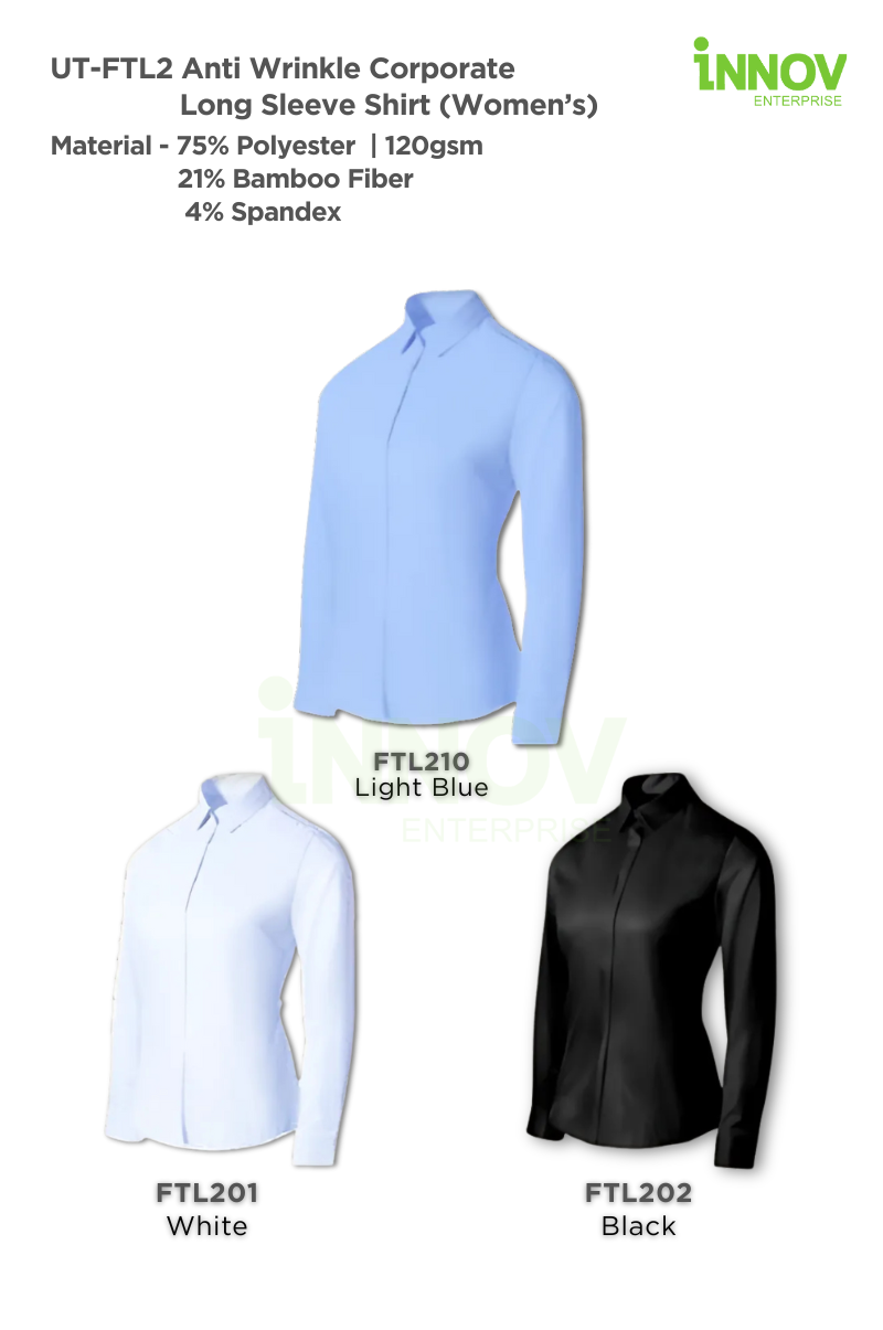 The UT-FTL2 Anti Wrinkle Corporate Long Sleeve Shirt (Women’s) is a refined and performance-focused Long Sleeve Wrinkle Free Dress Shirt tailored for the modern professional. Designed to deliver both elegance and practicality, this shirt maintains a smooth, polished appearance with minimal ironing—perfect for busy workdays, corporate events, and business travel.