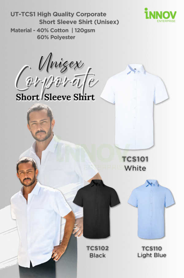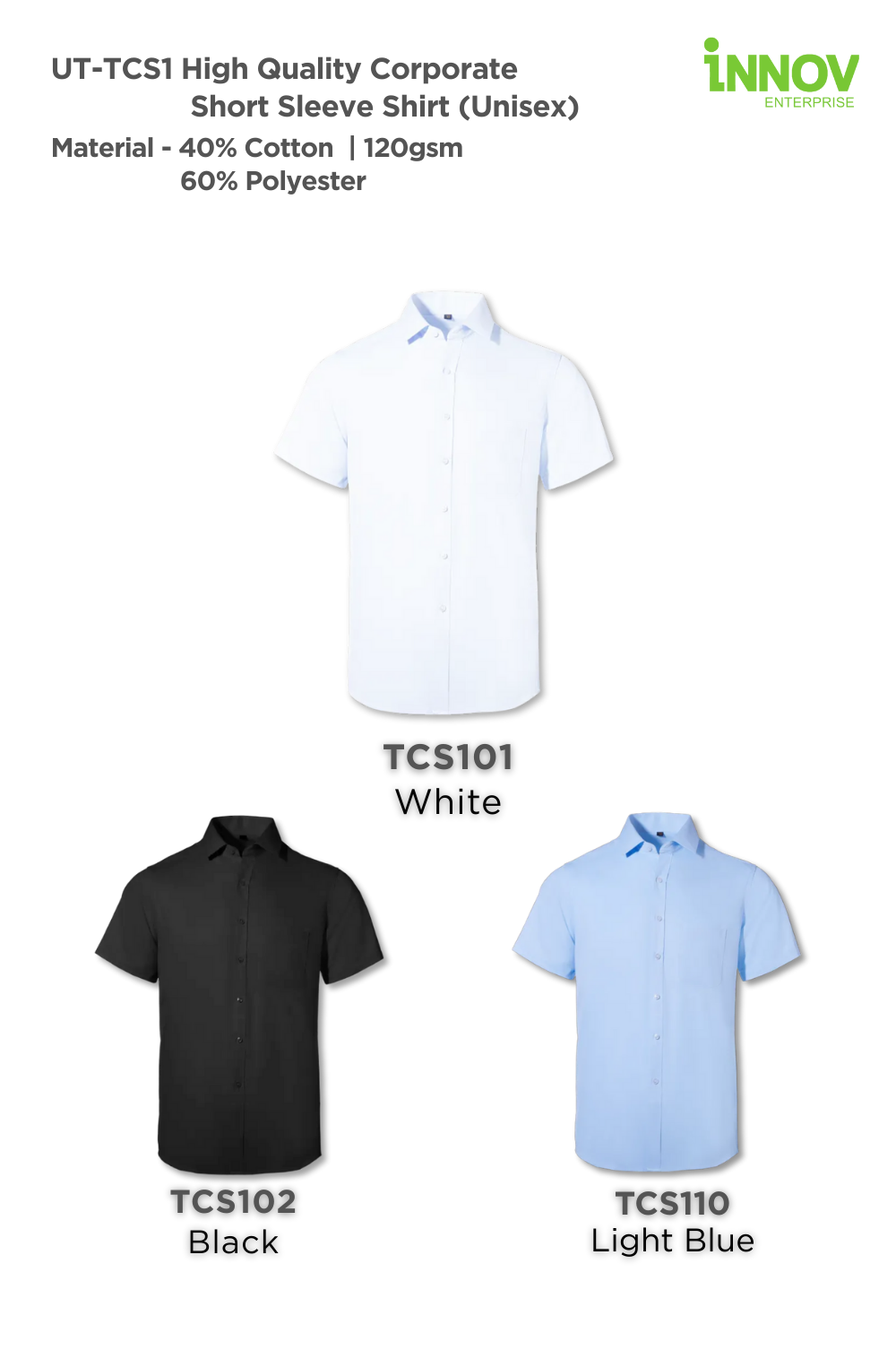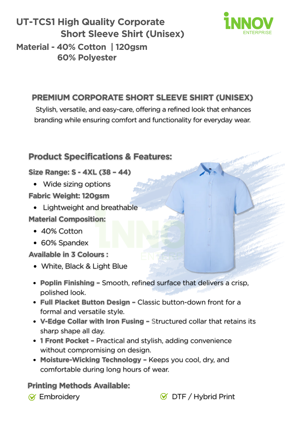 The UT-TCS1 High Quality Corporate Short Sleeve Shirt (Unisex) is a versatile and professional wardrobe essential, perfectly designed for corporate teams, uniforms, and branded events. Made from a premium 40% cotton and 60% polyester blend at 120gsm, this shirt combines the breathable softness of cotton with the durability and easy-care qualities of polyester, ensuring long-lasting wear and minimal maintenance. Its lightweight construction with a smooth poplin finish delivers a crisp, polished appearance that stays sharp throughout the day, while the classic full placket button design, V-edge collar with iron fusing, and a practical front pocket add both style and functionality. Featuring moisture-wicking technology that keeps the wearer cool, dry, and comfortable, the UT-TCS1 is ideal for Singapore’s warm climate and long working hours.